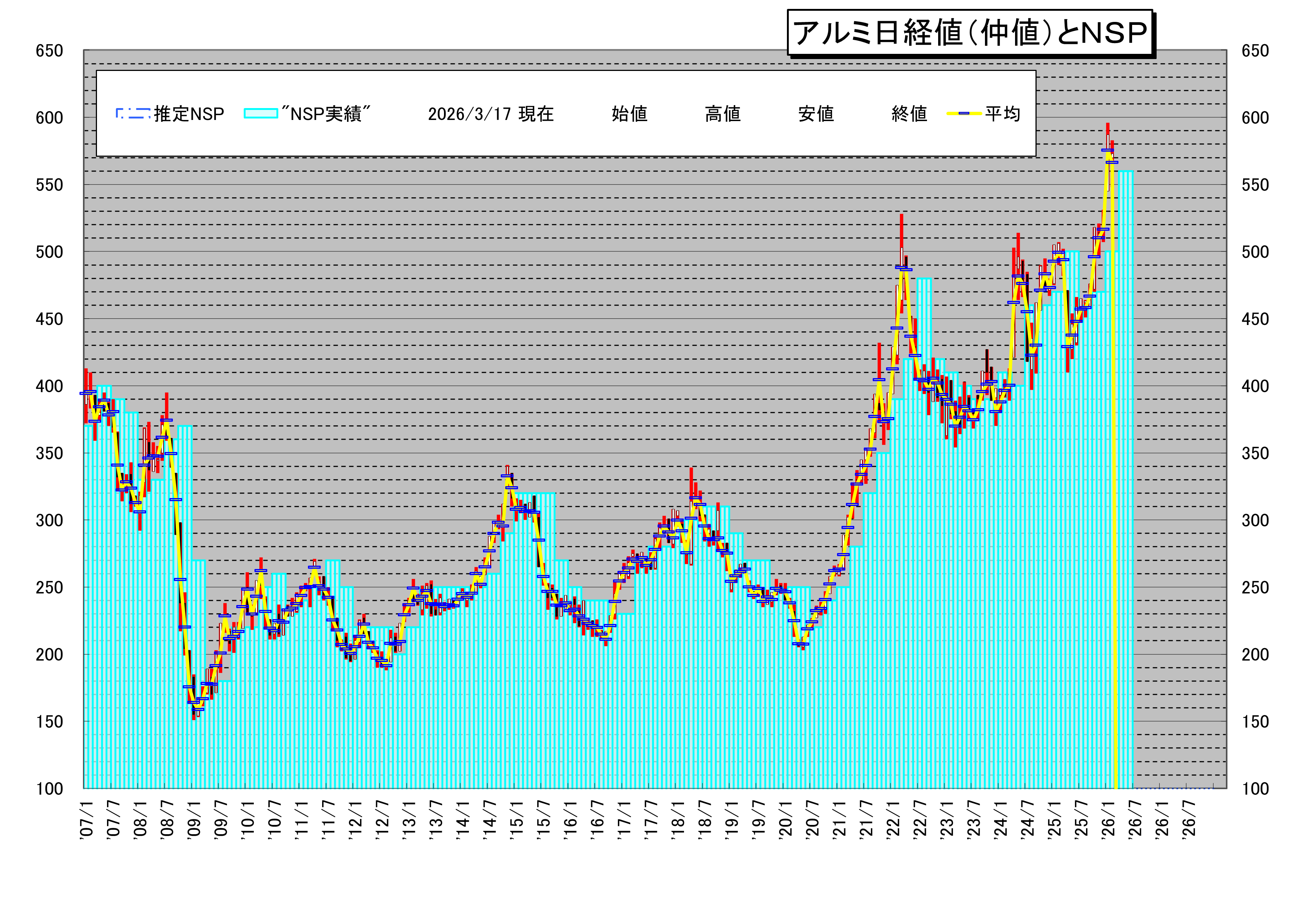 アルミ地金 2026/03/17 【地金相場】2025年11月アルミ地金相場情報 2025年11月アルミ地金相場です。11月の月間平均地金は510.9円となりました。2026年1-3月のNSP価格は前期比+30円/kgの500円/kgとなります。 ~NSPルールとは~ 日本国内で、アルミの地金相場をアルミ製品価格に反映させる為のルールです。 NSPとは「New Standard Price」の略です。 価格決定ルールは、3ヶ月単位の地金平均の一桁目を四捨五入し、 +10円(エキ...